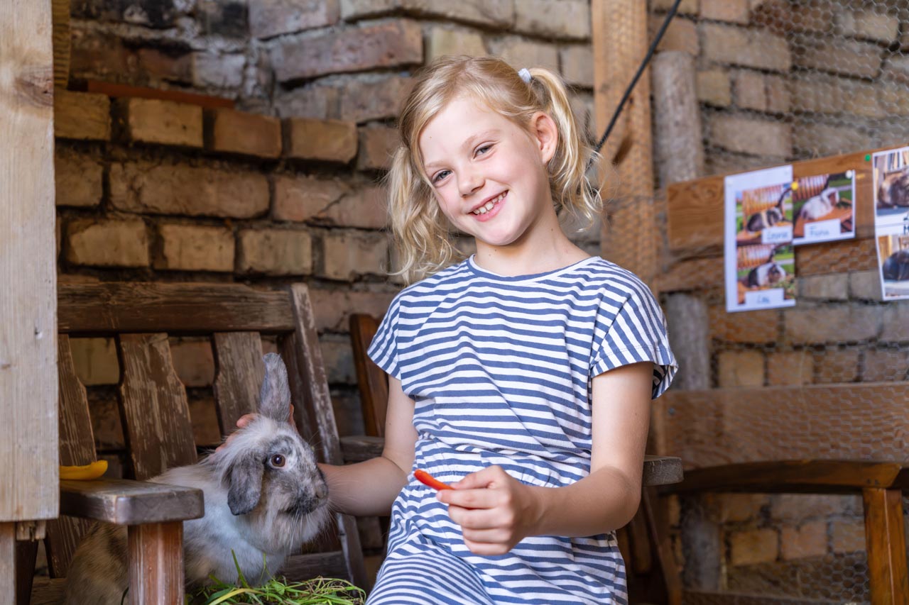 Im Winter oder wenn das Wetter mal nicht so mitspielt, bieten unsere Tiere im Stall, die Spielscheune und der Spielekeller eine tolle Beschäftigung.