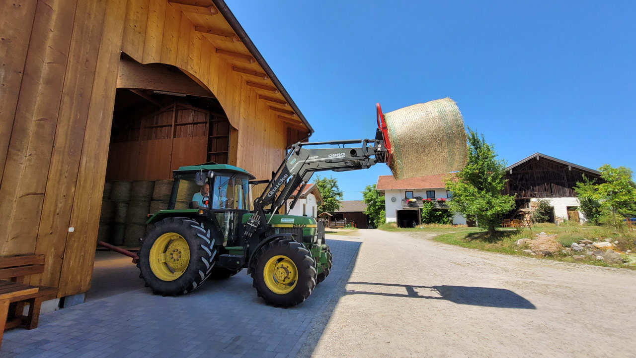 Das Futter für die Tiere erzeugen wir selbst. Je nach Jahreszeit und Wetter könnt ihr bei der Heuernte oder Getreideernte dabei sein.