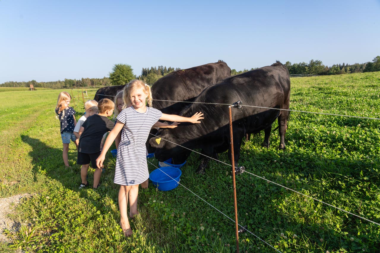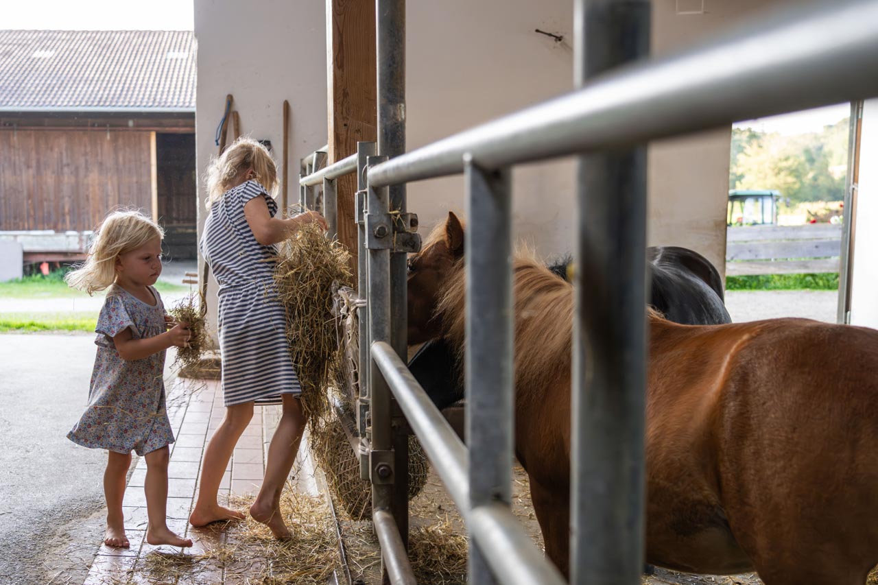 Die Tiere im Stall müssen regelmässig gefüttert werden. Wer Lust hat, darf dem Bauern bei seiner täglichen Arbeit im Stall helfen und je nach Jahreszeit und Vegetation bei der Feldarbeit mit dem Traktor mitfahren.