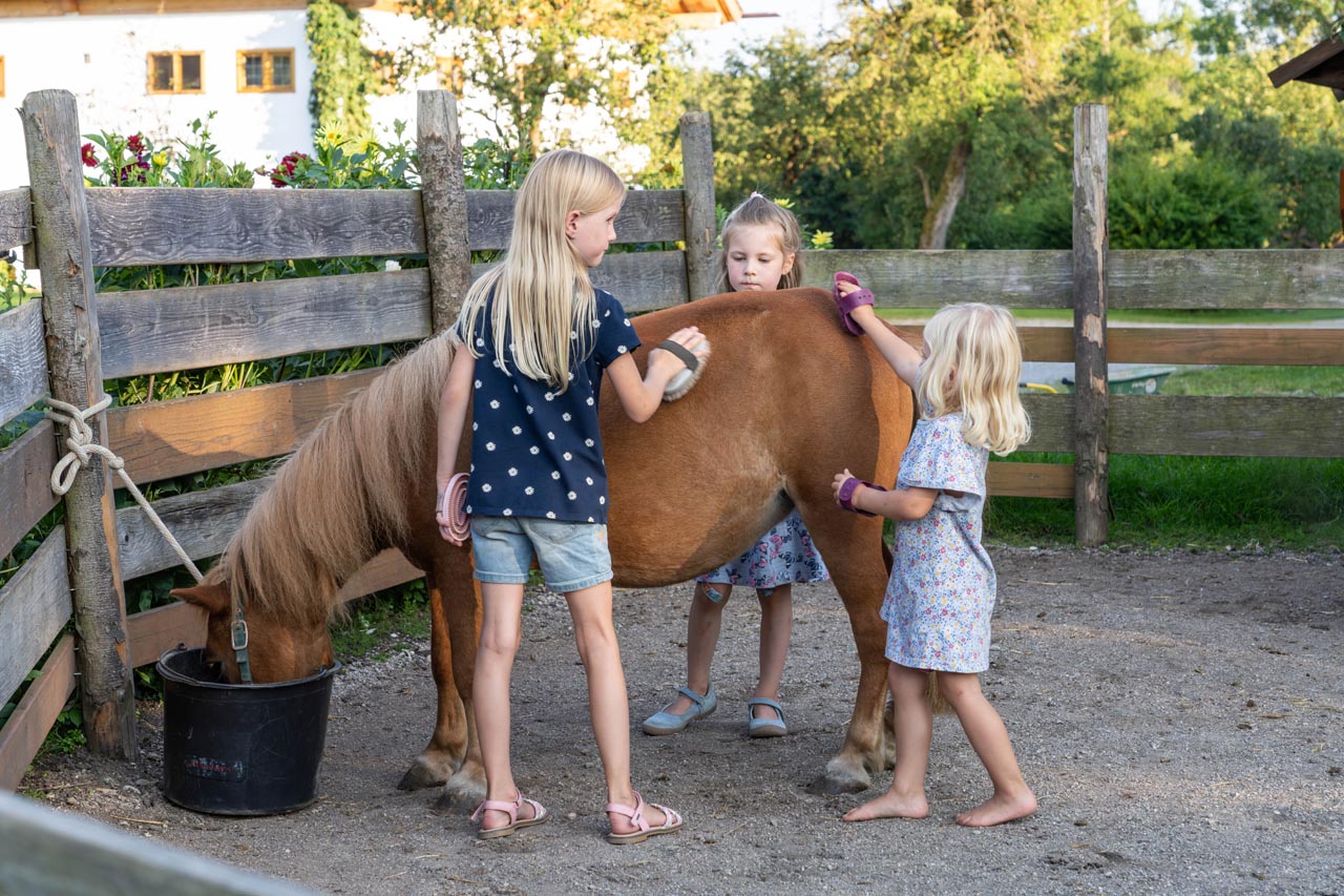 Der Hagerhof ist auch ein richtiger Bauernhof mit Tieren und einem kleinen Kuhstall. Hautnah könnt ihr die Tiere erleben, streicheln oder striegeln, unter unserer Anleitung füttern und natürlich ausmisten.